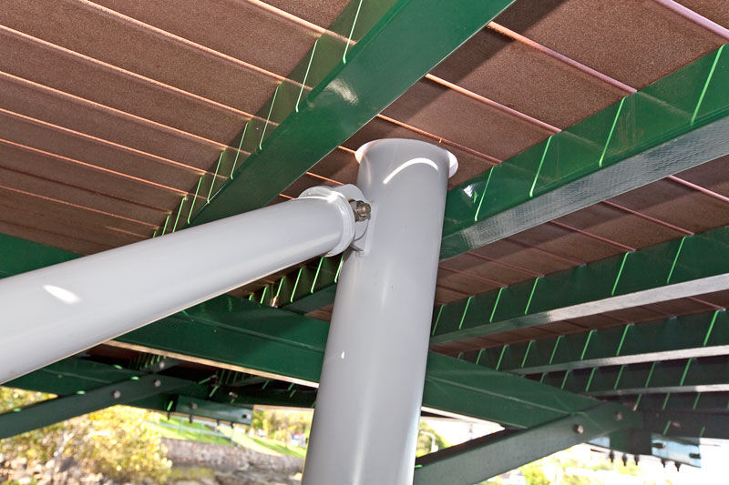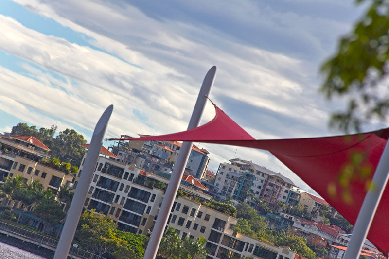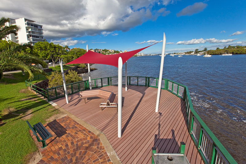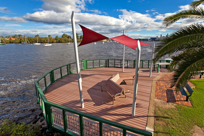Solution The final solution designed and installed was a five posted HYPAR shade sail system. With posts extending from the riverbed below, the system was finished in a white powder coat to compliment the white paint used on the balustrade around the perimeter of the deck. A bright red sail was installed to create a feature pop of colour and provides enough shade for most of the deck as well as seating installed below. This final design was the winner of an International Fabrics Association (IFAI) Outstanding Achievement Award in 2010.