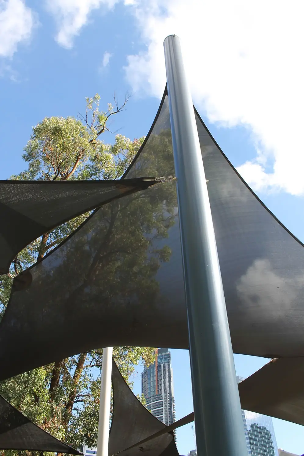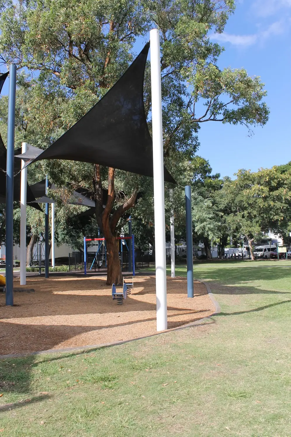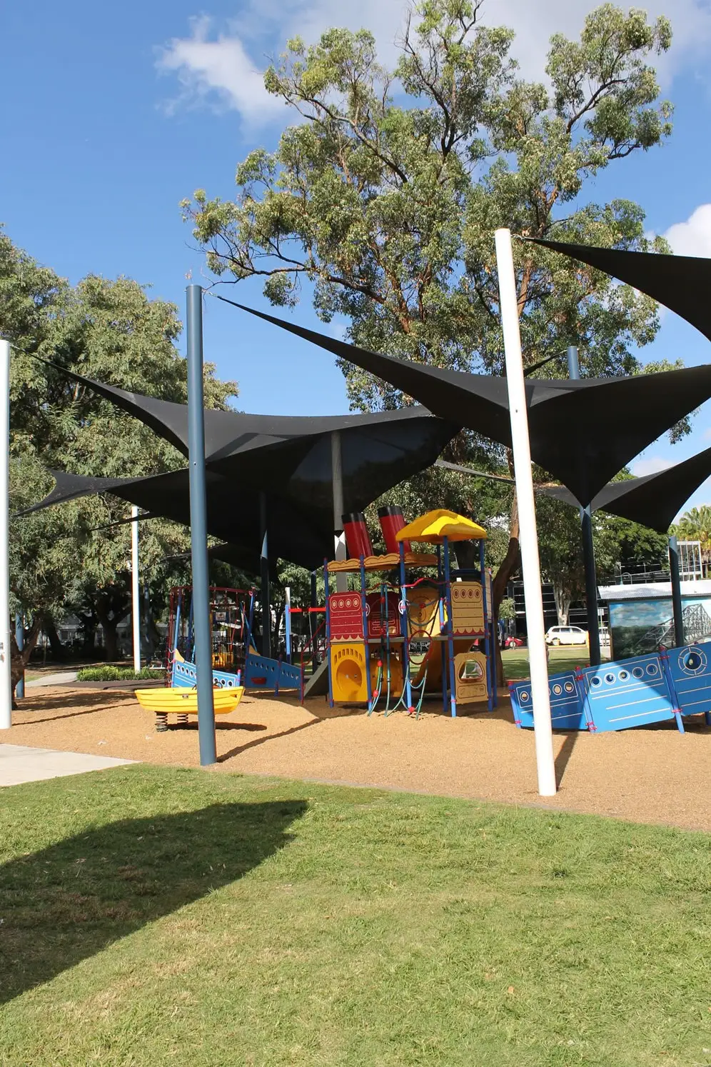 The final solution for Captain Burke Park was a shade install comprised of seven linked HYPAR shade sails. These sails were designed and delivered to provide as much shade coverage to the playground equipment as possible. Finished in cool colours, both the powder coated posts and Monotec shade fabric complement the existing playground whilst not standing out a detracting from the surrounding city and river views. 12 months after the initial install, council requested an addition sail be installed which was delivered by the team at Advanced Shade Systems adhering to same aesthetic as before.