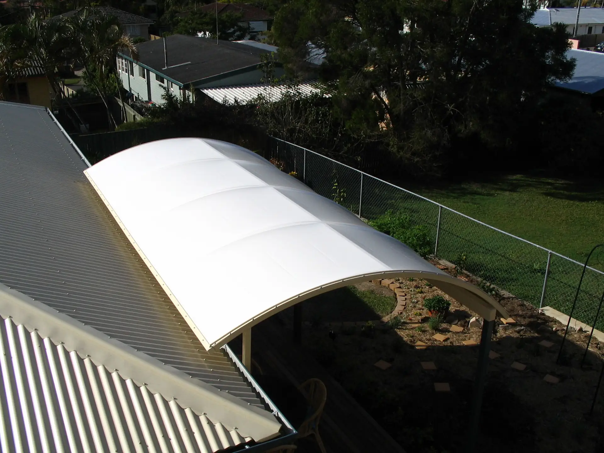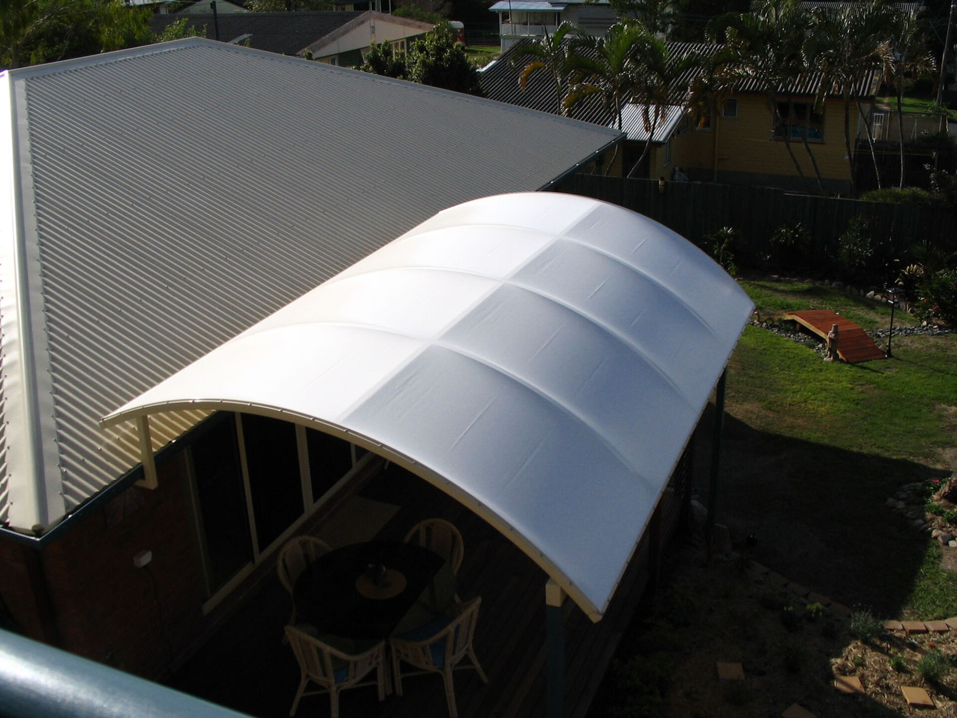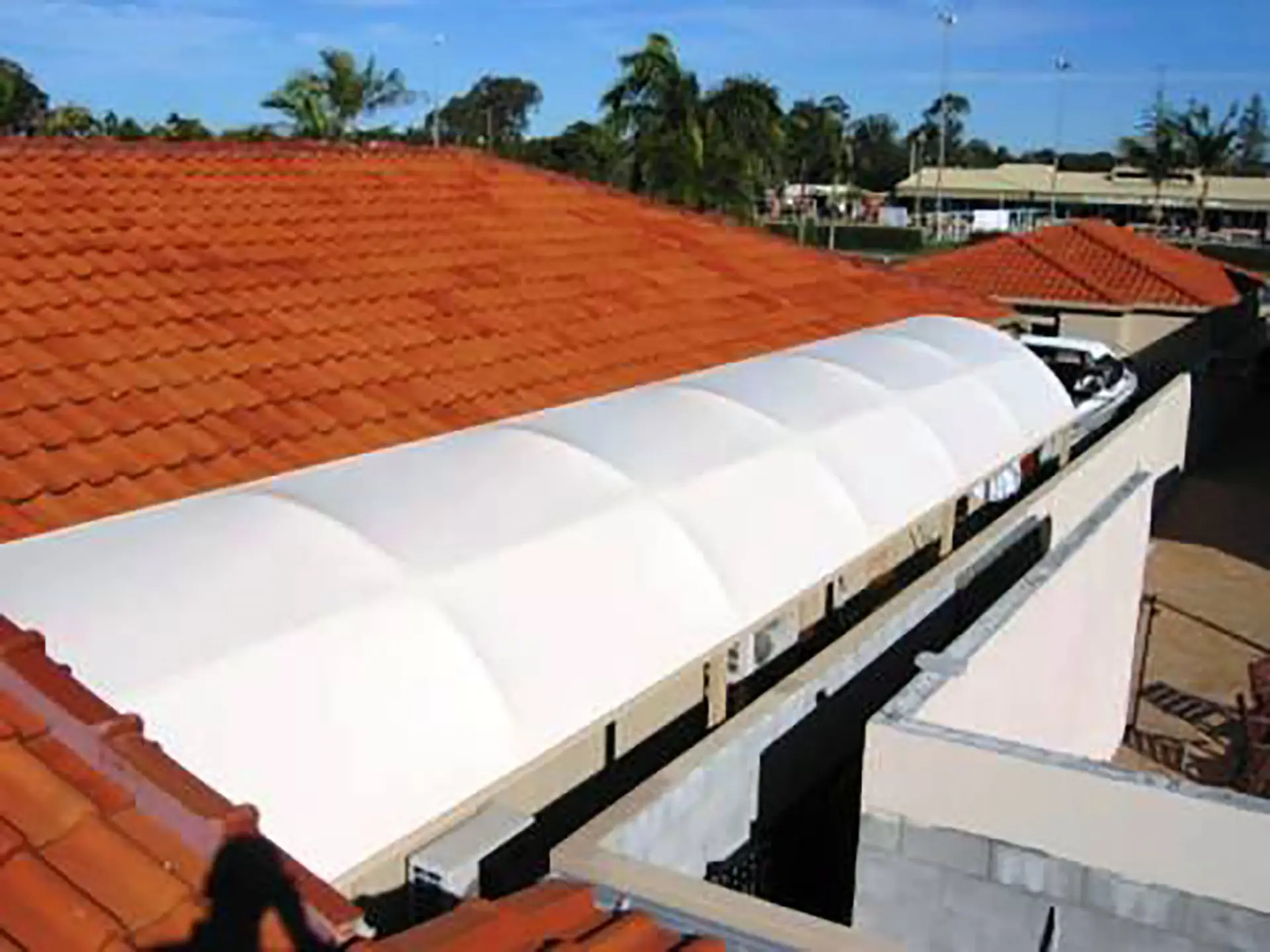 The vinyl fabric top is supported by a barrel vault roof system, which creates highly effective water and debris runoff system. Natural light passes through the fabric during daylight hours, reducing the need for additional lighting.