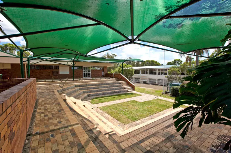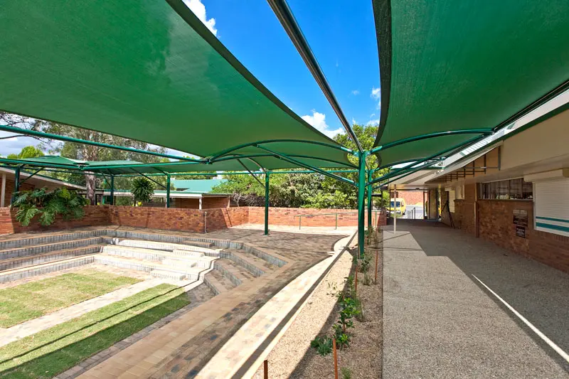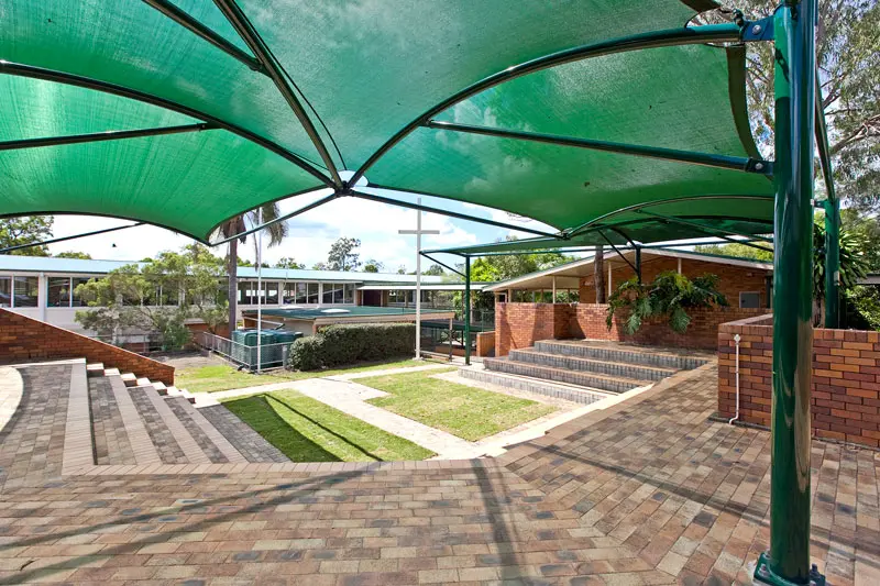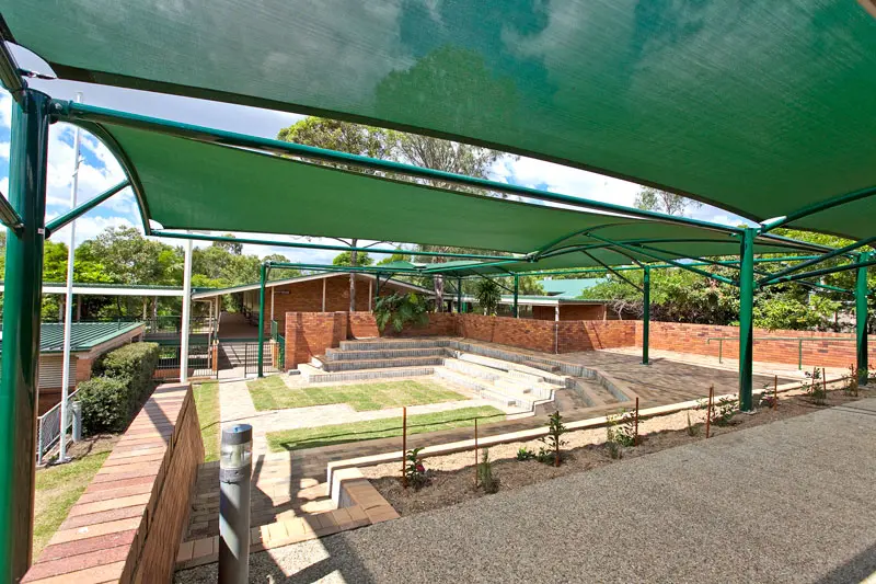 The purpose of the new shade structure at St. Mark’s School, Inala was to provide an effective shade system over the amphitheatre seating area without heavily impacting on the pedestrian pathways in the area. The challenge was to design a custom shade structure that would protect the area from sunlight and glare during school hours, while offering a full view of the cross from every seat in the theatre.